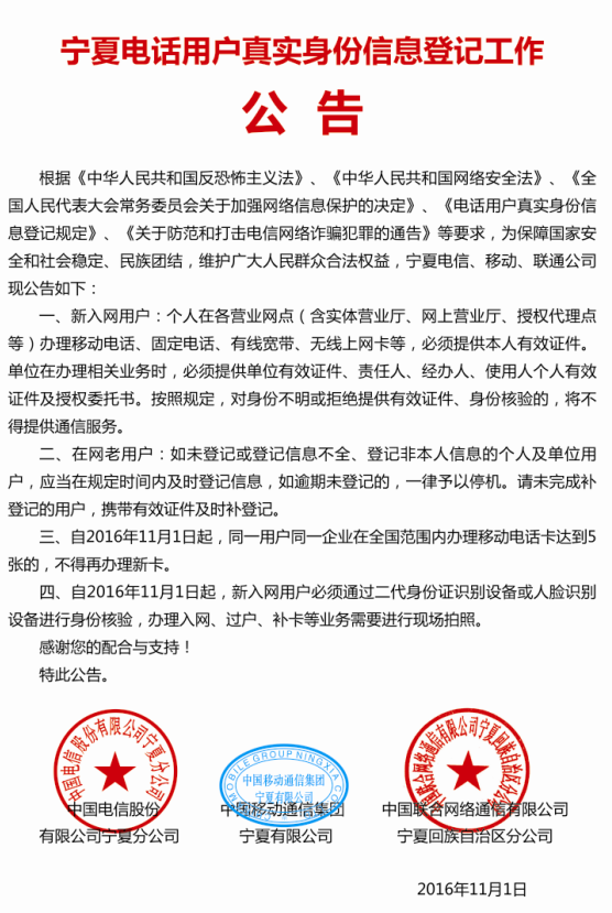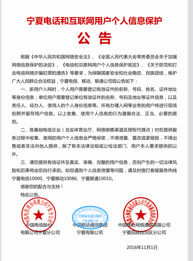 宁夏电话用户实名登记与信息保护公告