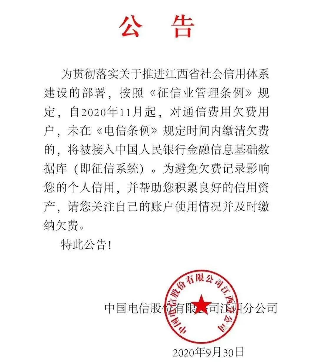 近日,中国电信江西分公司发布公告,称自2020年11月起,对通信费用欠费用户,未在《电信条例》规定时间内缴清欠费的,将被接入中国人民银行金融信息基础数据库(即征信系统)。