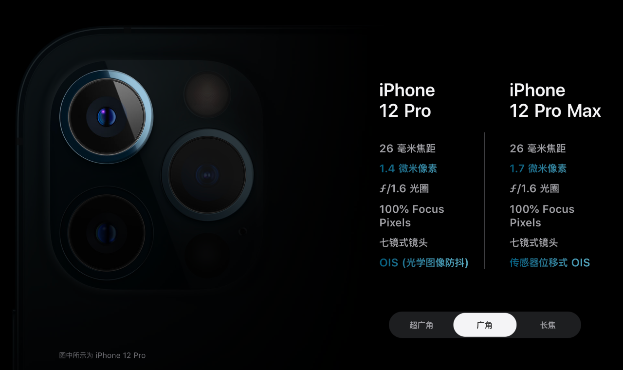 12 Pro Max 长焦摄像头的光圈小于 12 Pro,分别为 ƒ/2.2 和 ƒ/2.0。
