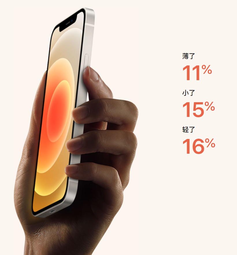 5.4 英寸的 iPhone 12 mini 是市面上最小、最轻、最薄的 5G 手机,比 4.7 英寸的 iPhone 6/6s/7/8/SE 2 还要小、还要轻。厚度虽然比 SE 2 增加了 0.1mm,但比 iPhone 11 薄了 0.9mm。